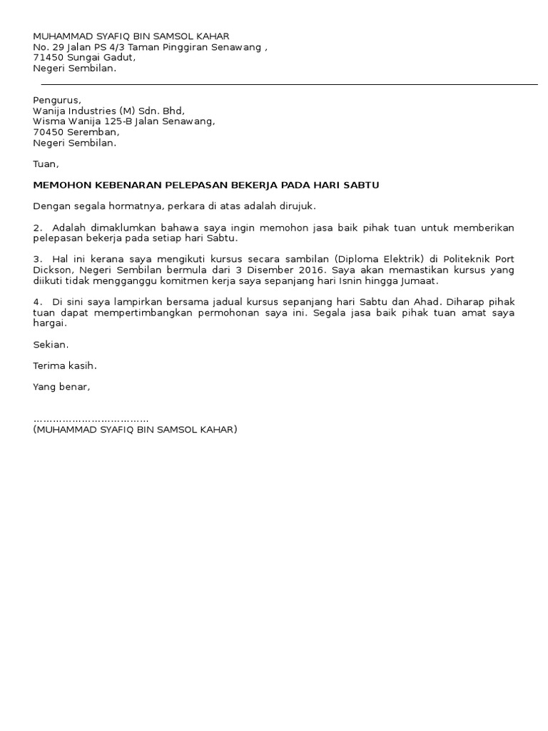 Dengan hormat yang bertanda tangan dibawah ini. Download contoh surat permohonan cuti kerja. Polis memberi pelepasan kepada mereka yang menggunakan surat lama miti untuk perjalanan atas urusan kerja sehingga 3 jun ini.